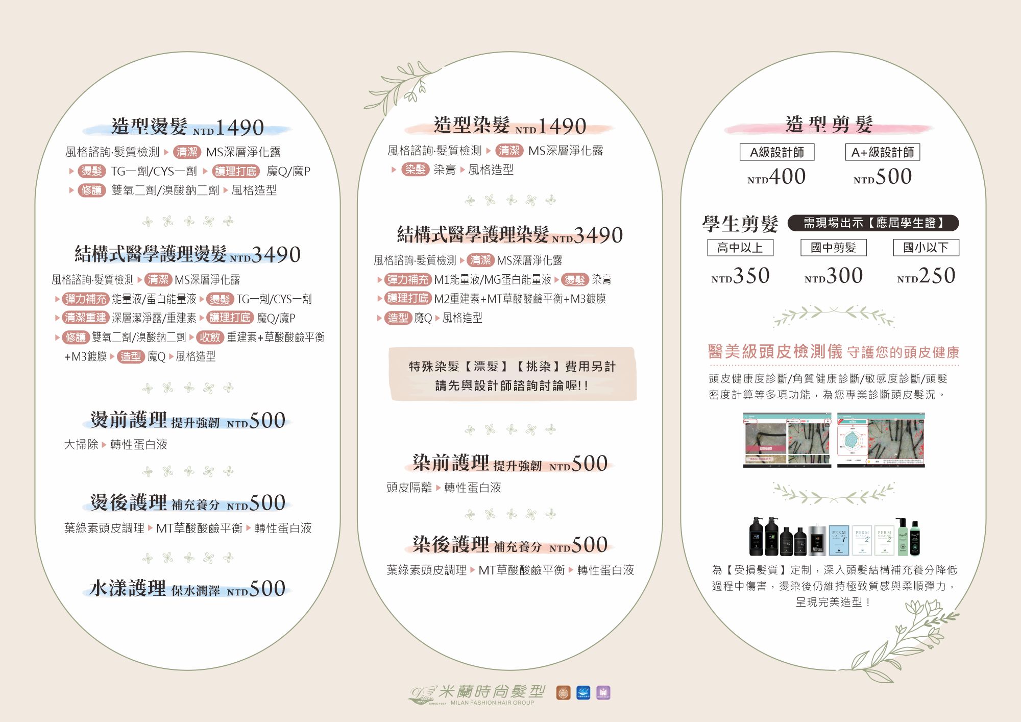 米蘭時尚髮型29年來在美髮專業技術服務的領域上不斷推陳出新、精益求精,我們與來自歐洲、擁有專屬研發中心的專業美髮品牌合作,以天然先進的自然萃取法則,重視髮絲的健康根本,無論是專業剪髮造型、頭皮養護、風格燙髮、時尚髮色,等造型及保養週期規劃,在米蘭時尚髮型都能享受最舒適的服務。